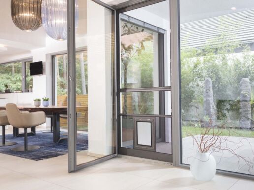 Insektenschutz-Türen von Clement vereinen Funktion und Design in Perfektion. Pendeltüren öffnen in zwei Richtungen und Schliessen von selbst – ideal für eine Balkontüre neben der Küche.