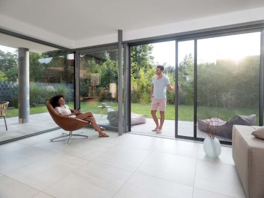 Schiebetüren kommen zum Einsatz, wenn breite Fensterfronten, wie Hebe-Schiebetüren, mit Insektengittern versehen werden sollen. Das Element ist im geschlossenen Zustand nahezu unsichtbar und garantiert eine gute Durchsicht.